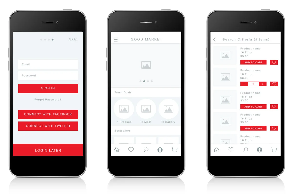The Good Market app was originally developed in an interaction design workshop through Designlab. We were provided a creative brief detailing user research and personas for a product that would allow users to shop at a local market on their mobile devices and receive groceries delivered at home. The design process included a competitive and usability analysis, developing user scenarios and flows, creating a sitemap, defining UI functionality requirements, and wire-framing the app interface; including on-boarding new users, searching and navigating for products, and a check-out process.